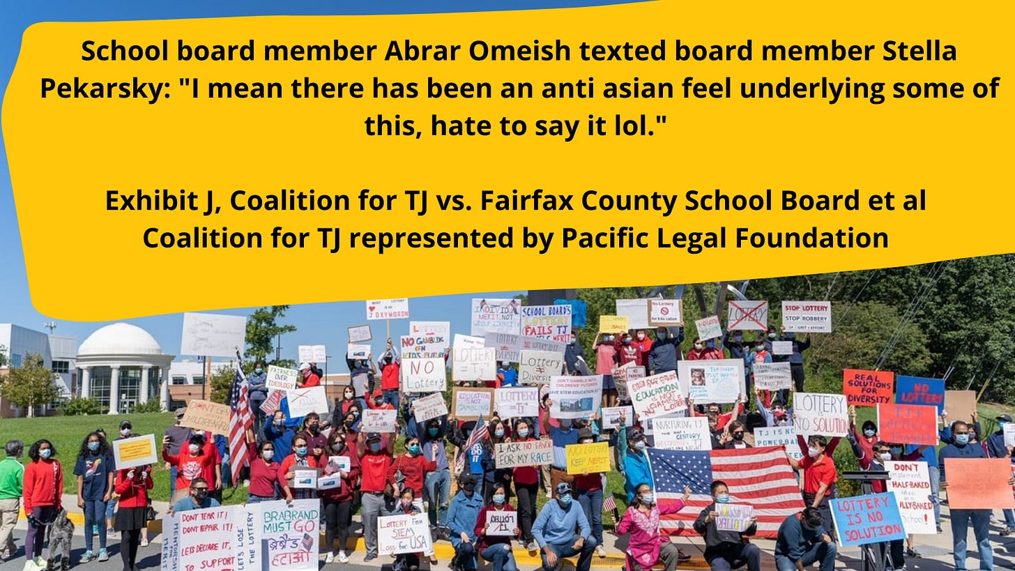 In late March, 4th Circuit Federal Judge Claude Hilton issued the “merits decision” that the admissions process is unconstitutional and anti-Asian. He included in his ruling a permanent injunction forbidding the school board from continuing to use the admissions process. The evidence was damning, including a text message from school board member Abrar Omeish, admitting the admissions changes were “anti asian….lol.”