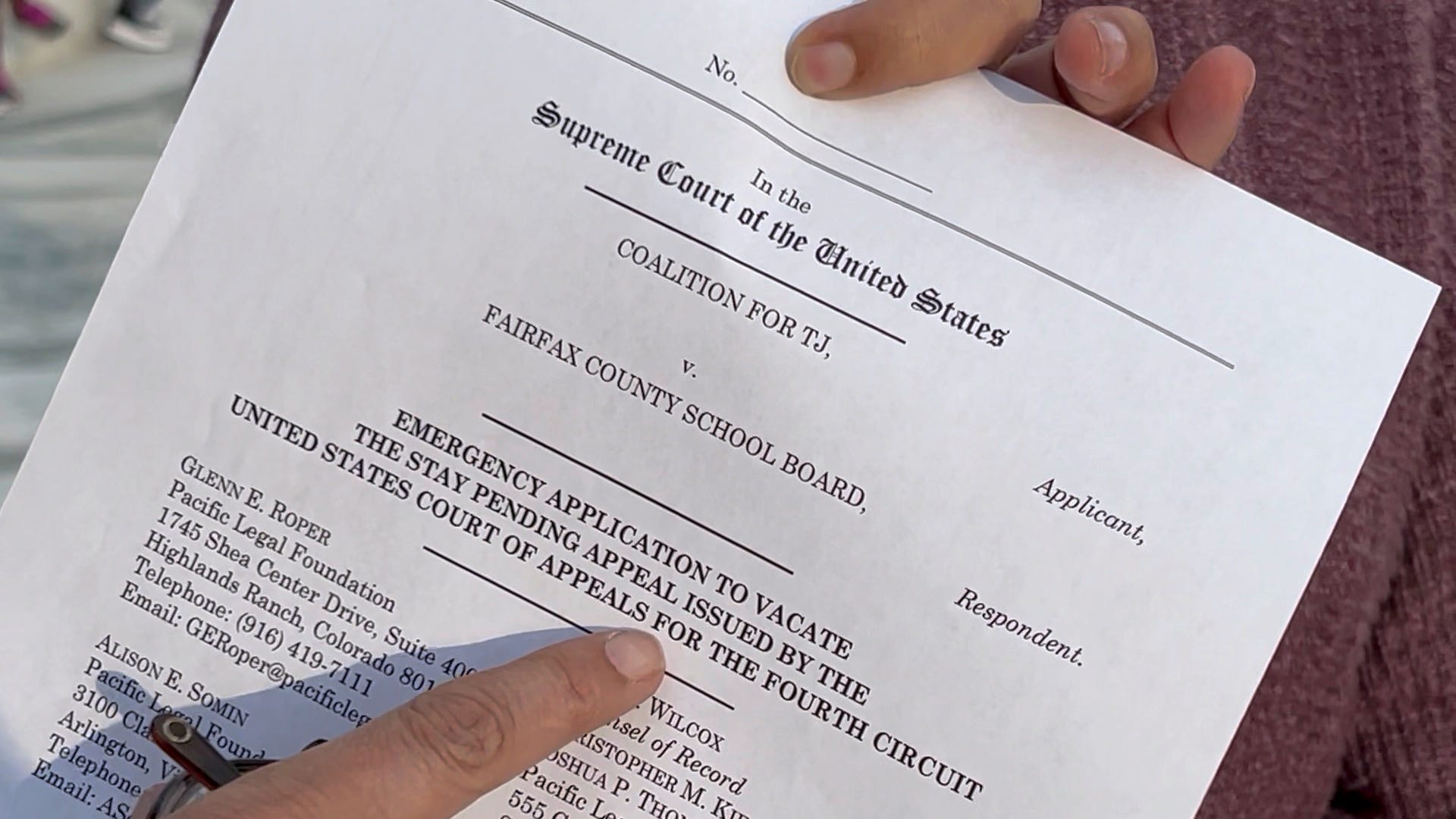 “Unless the stay is vacated, hundreds of Asian-American applicants to TJ, including children of Coalition members, will be forced to compete for seats at TJ in a system intended to discriminate against them because of their race….Because admissions decisions are imminent, the Coalition respectfully asks the Chief Justice, in his capacity as Circuit Justice for the Fourth Circuit, to vacate the stay pending appeal and reinstate the district court’s injunction.” (page 2)