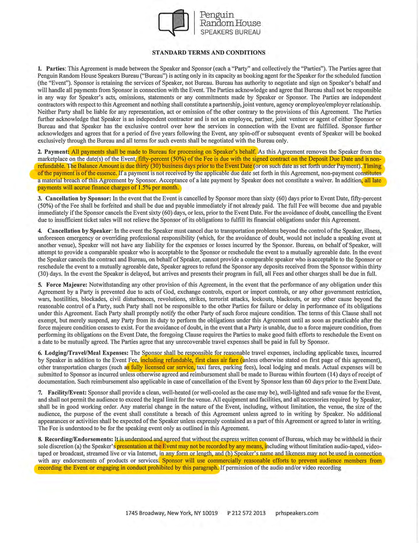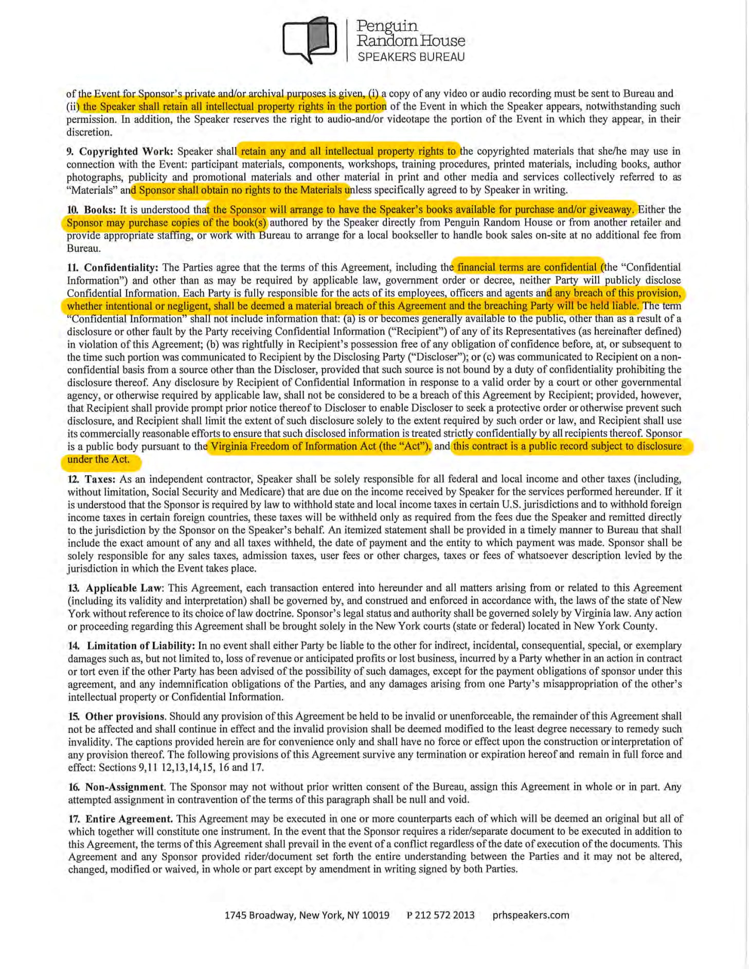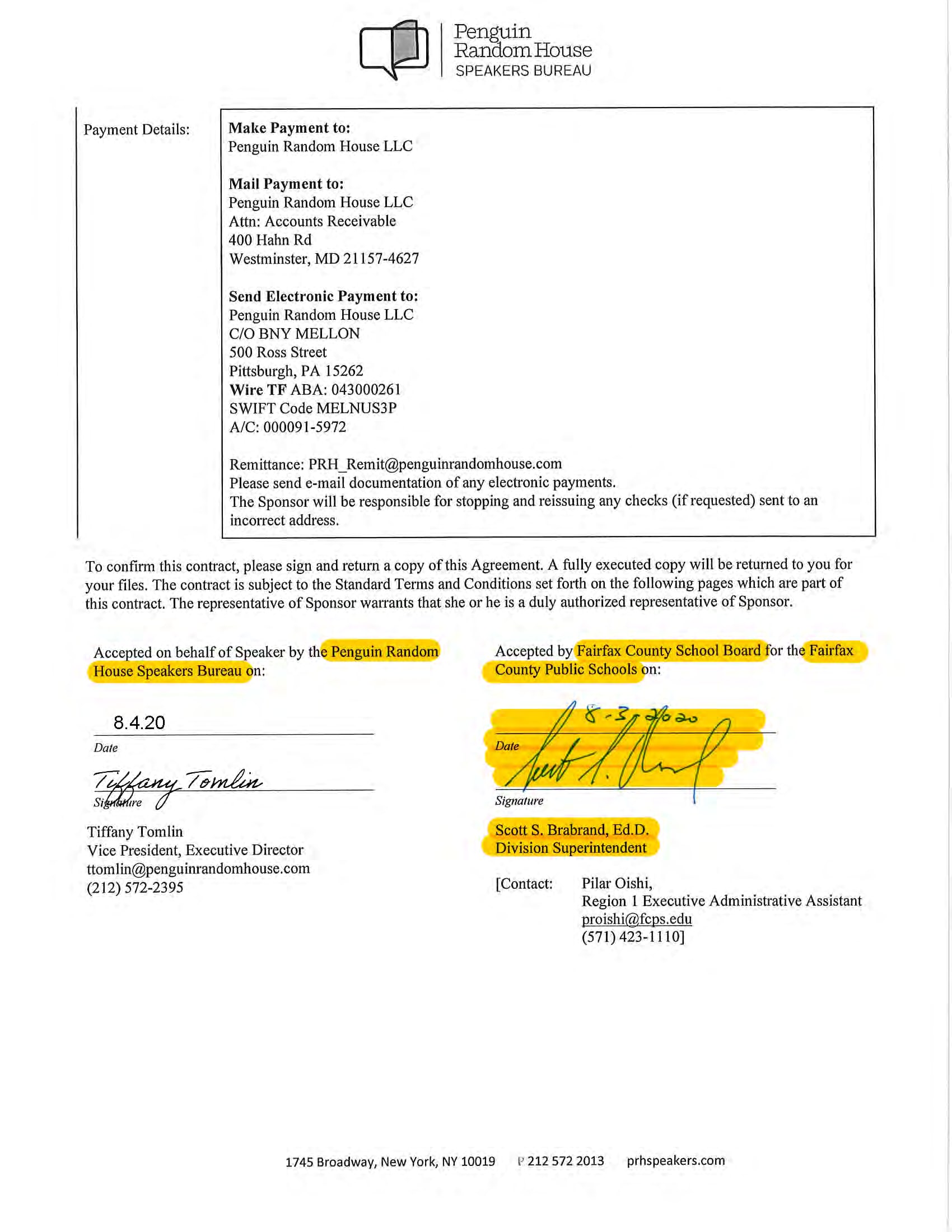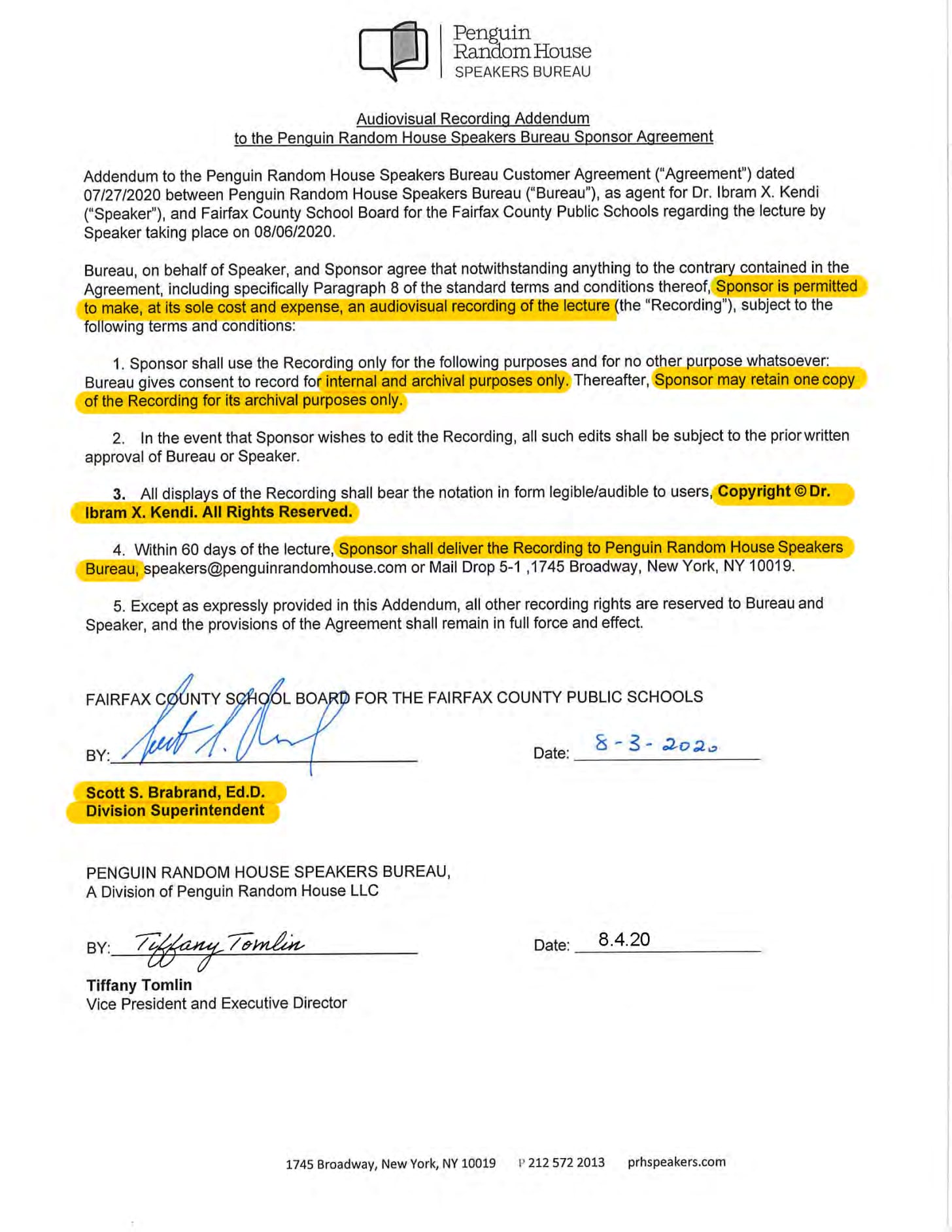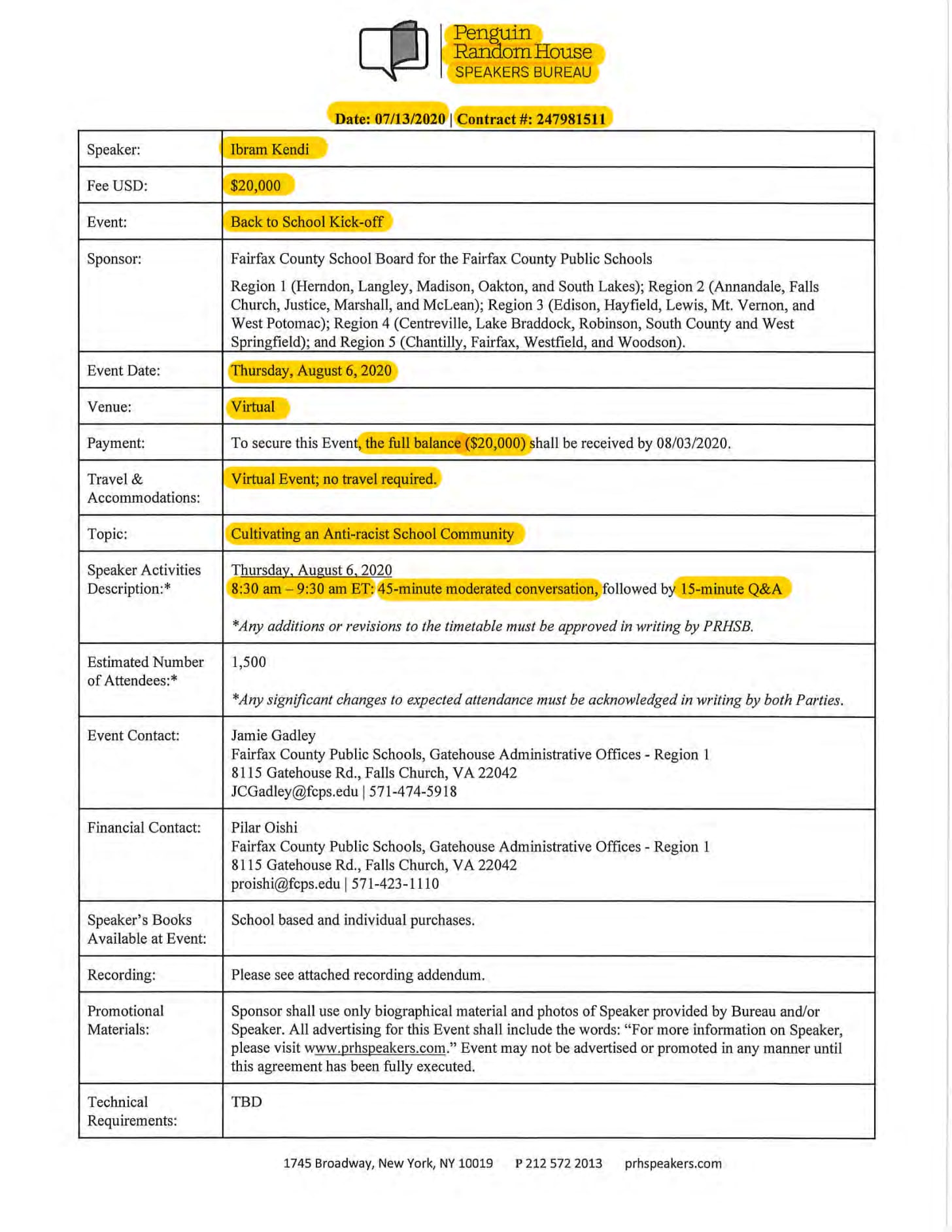 Below is the full five-page contract, No. 247981511, from Kendi’s Penguin Random House Speakers Bureau, marked “confidential” and signed by Fairfax County Public Schools Superintendent Scott Brabrand. The call was for a “45-minute moderated conversation” in a “Virtual Event,” “followed by a 15-minute Q&A.”