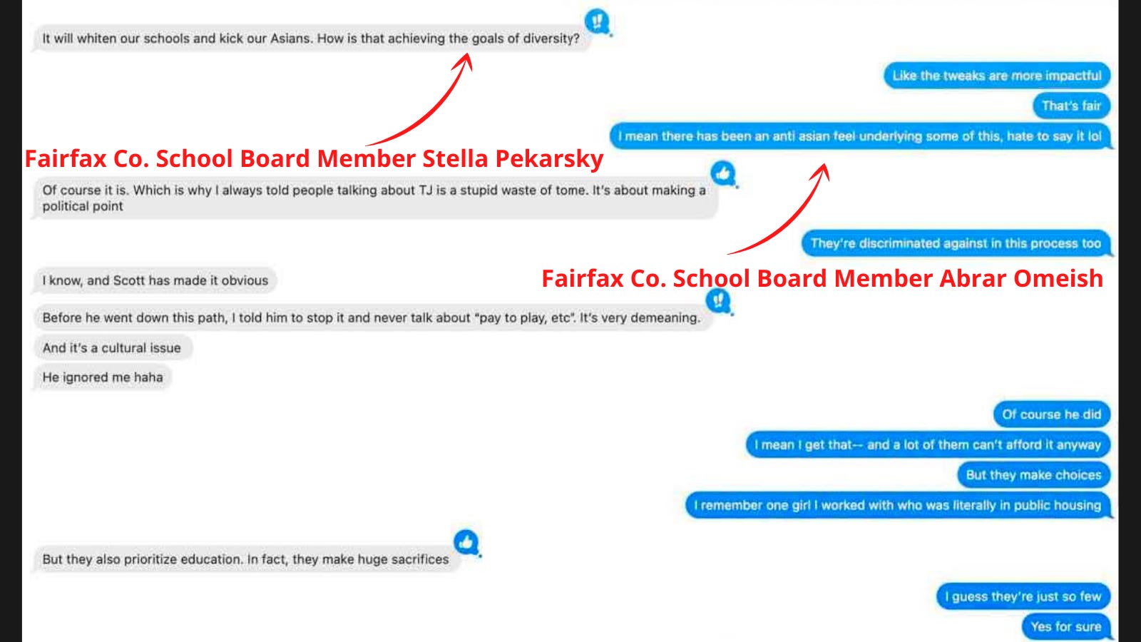 The back and forth by the board members is damning, insulting and indicting of political corruption and self-admitted racism and incompetence. It’s a window into what so parents around the country endure from corrupt school board members who make a mockery of our precious democracy. School board member Omeish said the admissions changes had an “anti asian feeling…lol,” other board members punctuating their comments with emojis and “haha,” as if justice and our kids’ futures are a laughing matter. Fairfax County school board members should all resign for their complicity in their unconstitutional racism and “embarrassing” incompetence, to quote their own words.
