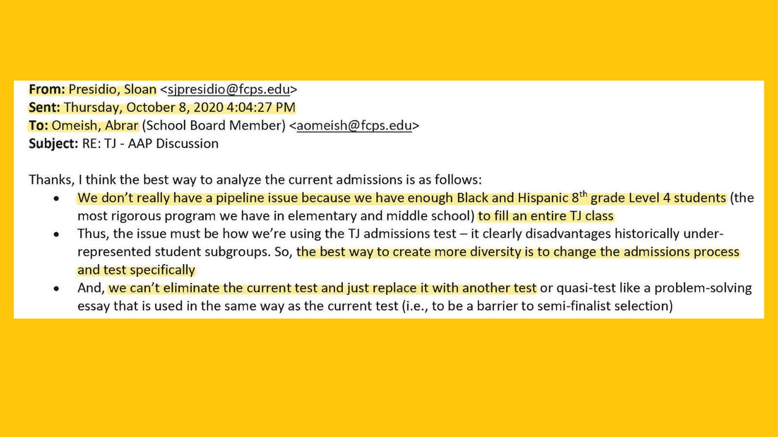 That same day, Oct. 8, 2020, at 4:04 p.m., Sloan Presidio, soon to be named the school district’s chief academic officer, told school board member Abrar Omeish, “We don’t really have a pipeline issue because we have enough Black and Hispanic 8th grade Level 4 students (the most rigorous program we have in elementary and middle school) to fill an entire TJ class.”