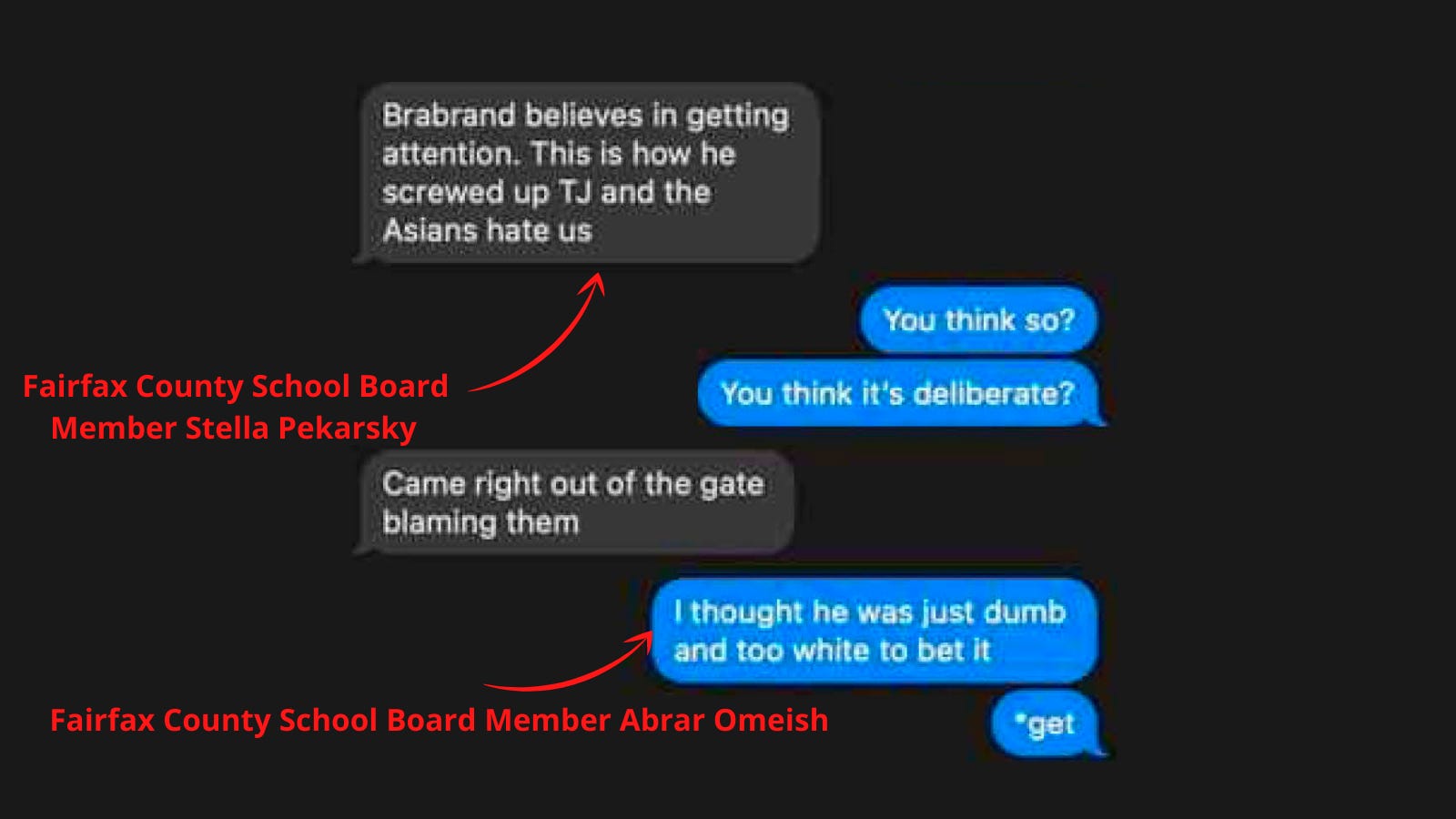 As school district officials engineered race-based admissions changes to America’s No. 1 high school, to increase the numbers of Black and Hispanic students, school board member Abrar Omeish sent board member Stella Pekarsky a text, saying: “I mean there has been an anti asian feel underlying some of this, hate to say it lol,” using the acronym for “laughing out loud.”