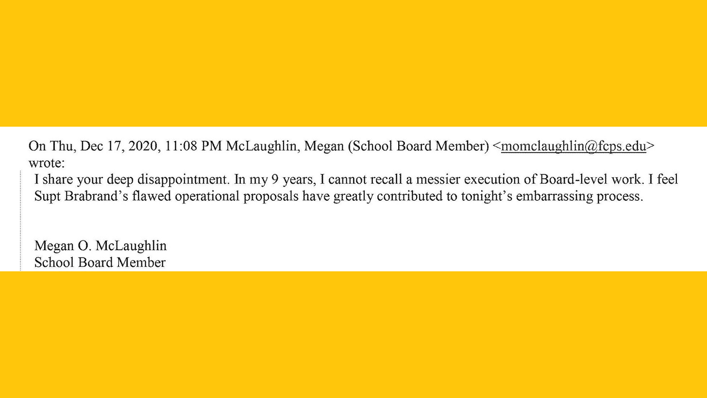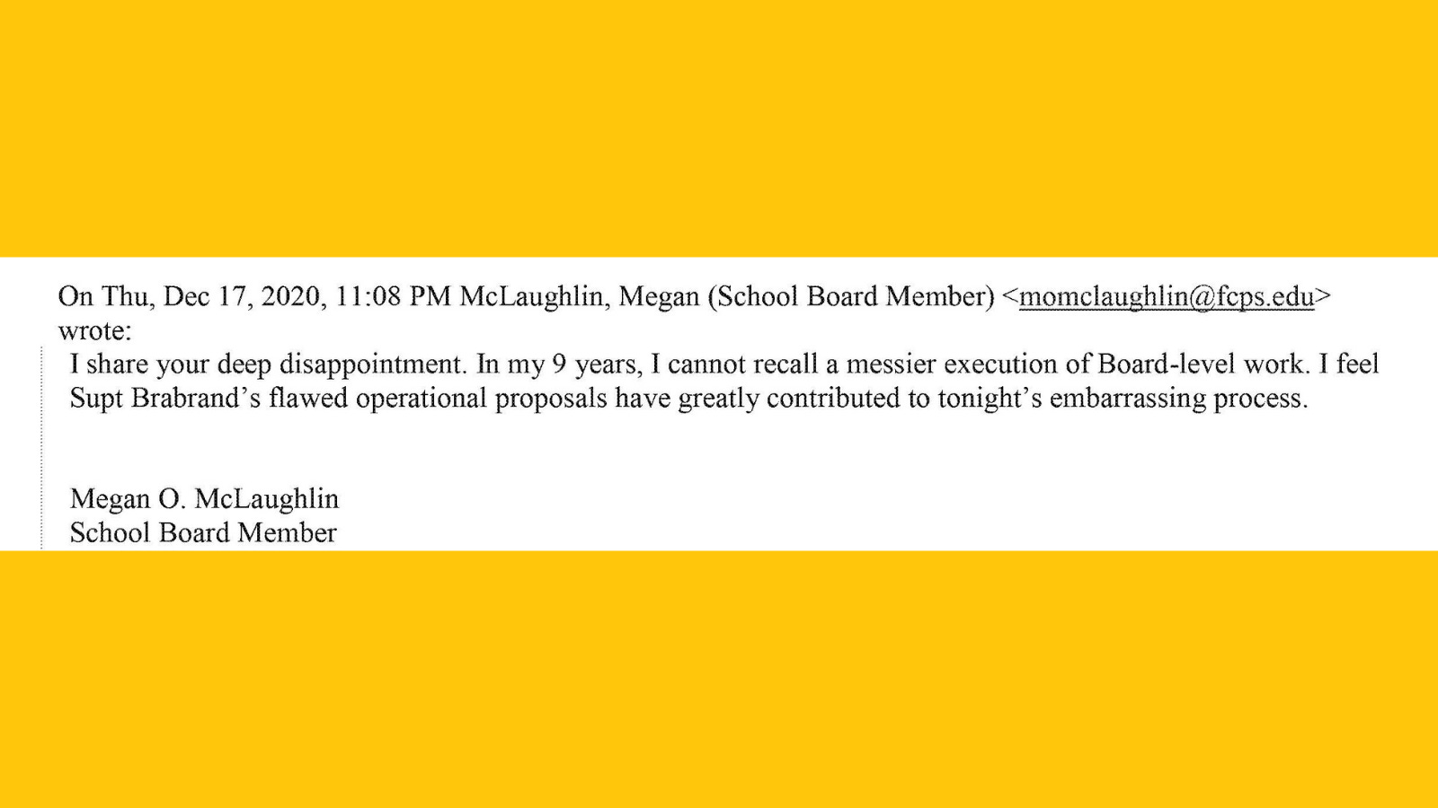 On Oct. 8, 2020, McLaughlin sent board members a text to tell them she was considering admonishing the superintendent with this message: “Sadly, Scott has personally created a highly divisive, harmful public debate that was absolutely avoidable,” “incorrectly” telling the board “(and the public) that we needed to make a rushed/unvetted decision,” based on the “diversity” report.